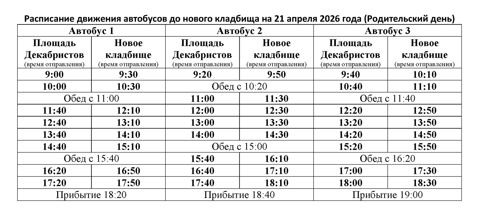 Расписание движения автобусов до нового кладбища на 21 апреля 2026 года (Родительский день)